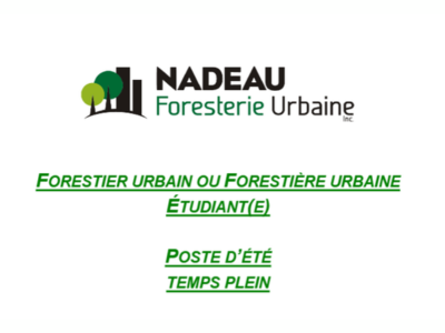 Vous étudiez en environnement, en foresterie ou en écologie végétale? Nadeau Foresterie Urbaine (NFU), chef de file en expertise conseil depuis 25 ans, est à la recherche de deux étudiant(e)s pour combler des postes de forestier(ère) urbain(e) cet été!