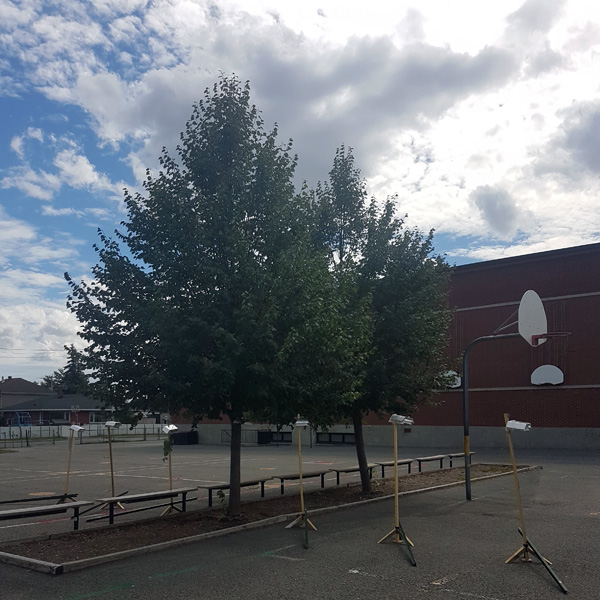 Les îlots de chaleur deviennent rapidement un plus grand risque à la santé des citoyens. En partenariat avec la ville de Laval, ce projet a comme but de mieux comprendre comment, et sur quelle distance, les arbres peuvent aider à diminuer les températures de surface. De plus, nous sommes intéressés à voir si cet effet est différent entre des surfaces minéralisées ou végétalisées. La recherche a lieu à des endroits, comme les cours d'école, avec une grande concentration de citoyens plus à risque (ex. les enfants). Pour se faire, nous installons des sondes autour des arbres, sur des surfaces minéralisées et gazonnées, afin de mesurer les changements fins dans la température. Le but est de pouvoir fournir à la ville un modèle plus précis sur les bienfaits thermiques qu'apporte les arbres aux citoyens, et comment la déminéralisation (substitution de l'asphalte avec des végétaux) peut aider à amplifier ces bienfaits.